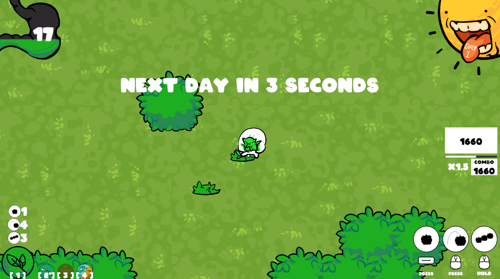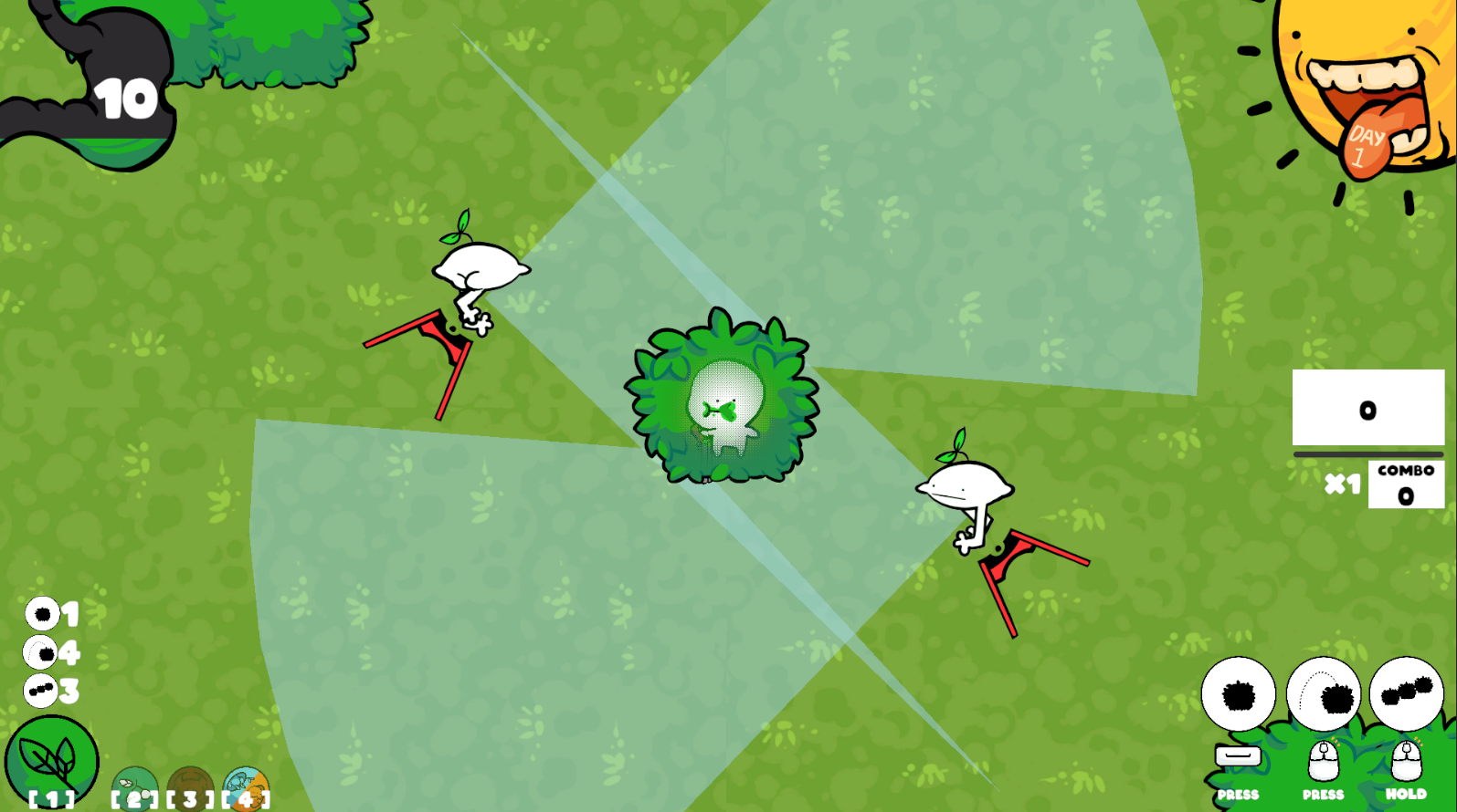 - Use seeds to place bushes with [Space], throw them with [Right Click] to grow a line of normal bushes in front of you with [Hold Right Click]